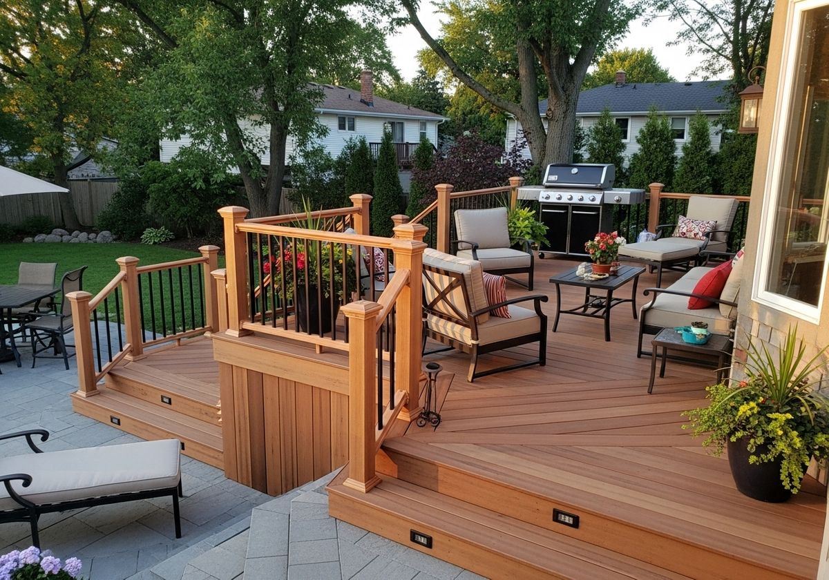 Multi-Level Decks: Ideal for properties with varying elevations, multi-level decks create distinct zones for different activities. For instance, you could have a raised dining area, a sunken lounge space, and a separate grilling station.